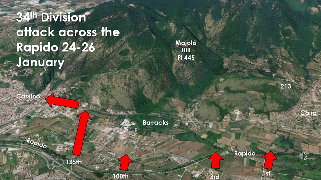 Day 1: Full Cassino day in the footsteps of the 34th Division (Cervaro, Monte Trocchio, Hill 56/213, Gari River, Abbey, Point 593, Cassino town & memorials).