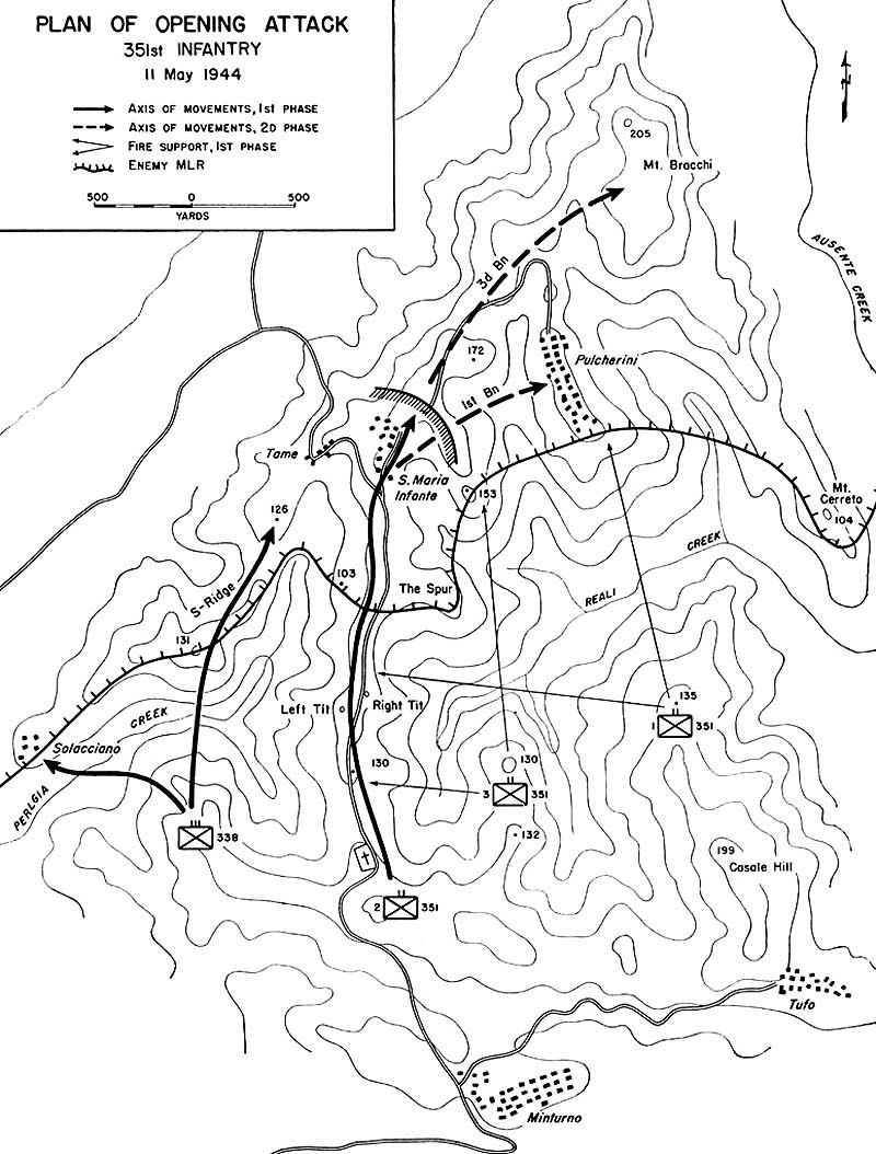 In the opening hours of the assault, the men of the 351st Infantry Regiment, 88th Infantry Division, moved forward from assembly areas near Minturno. Crossing ground already registered by German artillery, the regiment advanced uphill from the vicinity of the Minturno cemetery toward a complex system of spurs and ridges dominating the valley.
